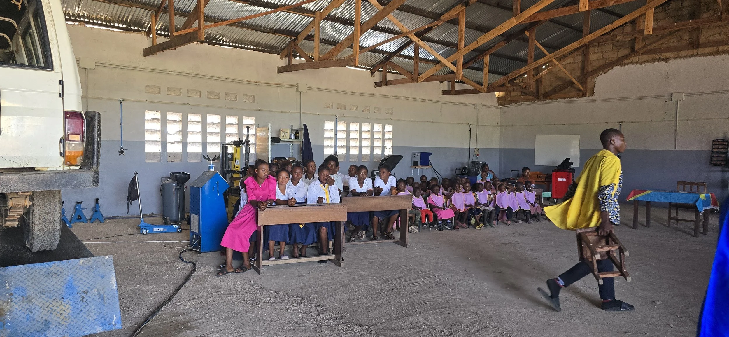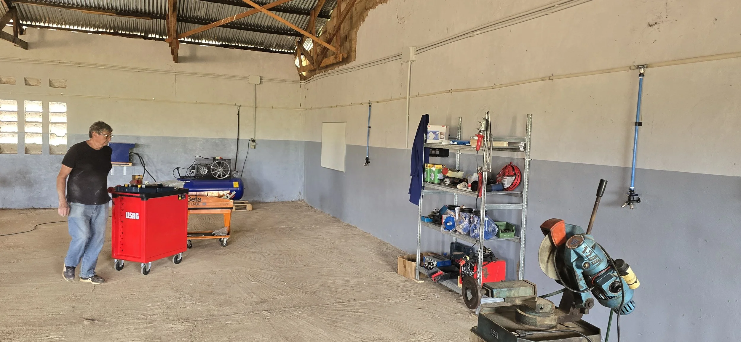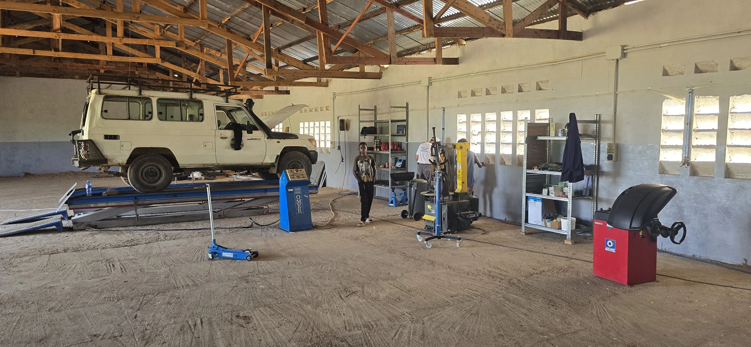 Nel mese di febbraio 2026 sono stati ultimati i lavori di installazione e ripristino funzionalità delle attrezzature giunte dall’Italia con il container per l’allestimento della Scuola Professionale di Meccanica. Si è reso necessario lavorare per ripristinare la funzionalità di alcuni mezzi che hanno particolarmente risentito delle difficoltà di trasporto, permetterne il funzionamento attraverso l’installazione di canalette per il passaggio di fili e cavi della linea elettrica e calate che collegano ad ogni macchinario e precisamente il tornio, le due troncatrici, i due compressori, l’essiccatore, l’equilibratrice, lo smonta gomme, i tre sollevatori; si è lavorato inoltre sul gruppo elettrogeno donato dal partner locale. In data 25/02/2026, alla presenza delle autorità locali, del parroco della Missione e degli studenti, è stata fatta l’inaugurazione dei locali.